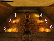 甲虫所在的房间-现在先不要下去,在右边(东)你可以看到一个火把。这个设计是用来帮劳拉的忙的,你可以用它转移甲虫的注意力。遗憾的是它并不是很有效。甲虫们还是会攻击劳拉。并且手持火把的时候劳拉无法攀爬。如果你还是认为这个火把能发挥作用,那么就过去拿起它,从旁边的火上引燃火把。