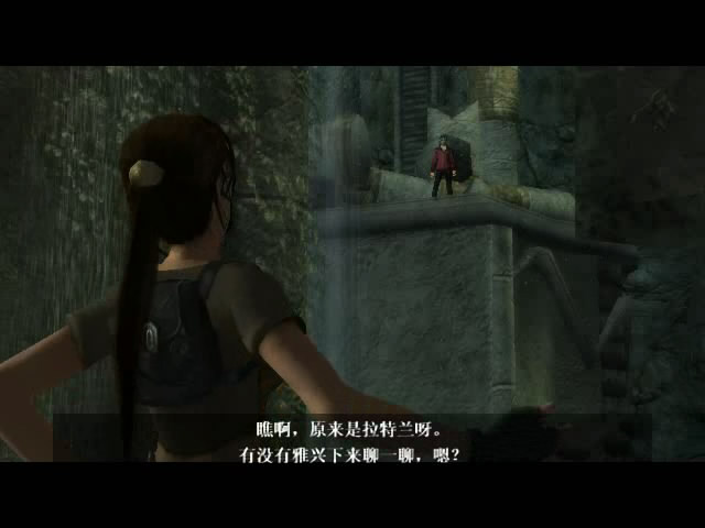 机关打开,整个瀑布都拉开了,露出了一座恢弘的神庙。泽普显然觉得那不是地方:“噢,这地方居然有座神庙。[1]”劳拉看着神庙,说道:“高门阔户总是爱搞些不切实际的花架子。如此方可彰显其『阔』。[2]”说着,劳拉打算进入神庙。这时,从高处传来一声招呼:“劳拉!你就从来不知道放弃吗?[3]”劳拉双手叉腰:“瞧啊,原来是拉特兰呀。”她邀请道,“有没有雅兴下来聊一聊,嗯?”拉特兰回答:“那得看你的射程够不够了。”劳拉说道:“要知道异地恋总是以悲剧收场的。[4]”拉特兰说道:“祝你好运,但是,呃……你知道……”接着他离开了。