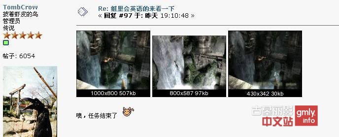 2007年,《古墓丽影:周年纪念》正处于宣传期,尚未发售时,TombCrow 因不满晶体动力对于游戏文化的表现,遂写了一篇草稿,委托朋友翻译成英语,张贴在了Eidos论坛。该贴引起了一场与国外玩家的论战。论战过程中,TombCrow在当时的中文站工作组内委托ilovelctr将回复翻译成英语,对国外玩家的质疑进行了回应。