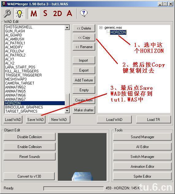 两边都准备好后,选中下载的蓝天白云Horizons,按Copy键,复制到tut1.WAS中,如果成功会提示是否覆盖,当然选择覆盖了。最后选择Save WAD按钮保存到tut1.WAS中,OK,替换天空成功啦!