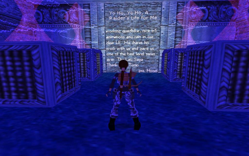 大厅的任务是到地面扳开关,干掉四个武士(特别注意,骑马那个摔下来后还会骑上去,所以一定要在他再次骑上去之前干掉他),捡到它们的宝石后安放,从水下的游到另一房间。(这里有些大厅的其他介绍如果你没有用秘笈调无限那弹药还是应该补充一下:先到桥另一头,跑跳抓到左边有开关,开右边的门,过去捡了大医药包再回到桥上。回开始这端,从铁链下去,用拐弯跳到右边平台,注意到一个矮洞。里面是隐秘地点,现在先跑跳抓到对面的楼梯下去。在地面,到东南角附近,再转身往上看,能看到高天花板上挂的一个摆球,射破它就可以进那个隐秘地点了)捡了Theon神器,跳过喷火台,再转身打破吊球,出门跑向摩托,过关。:)