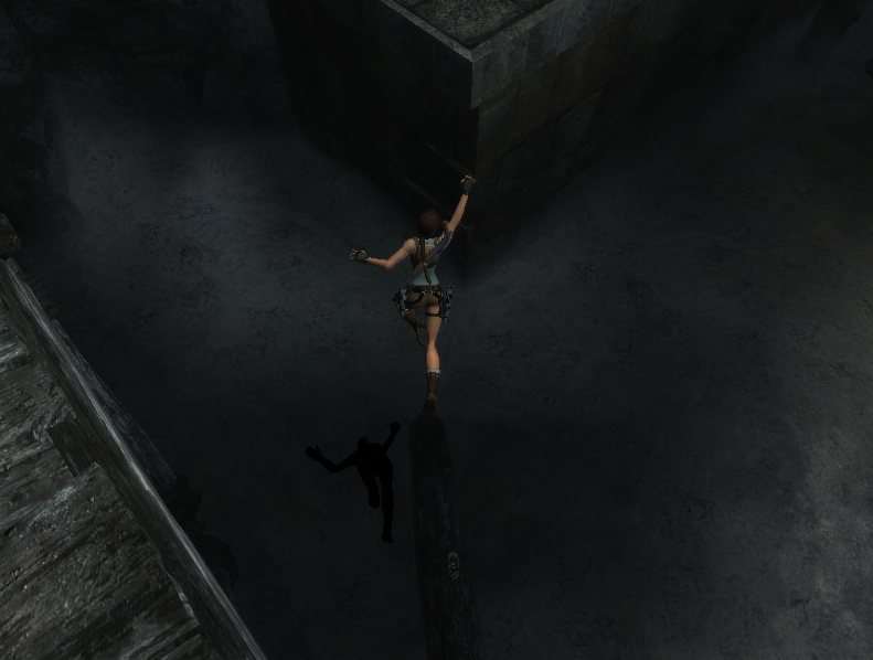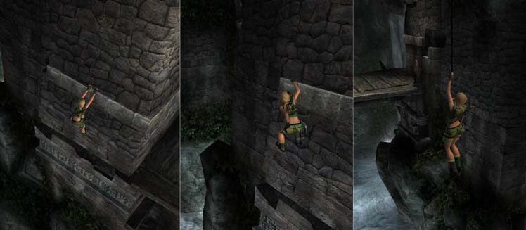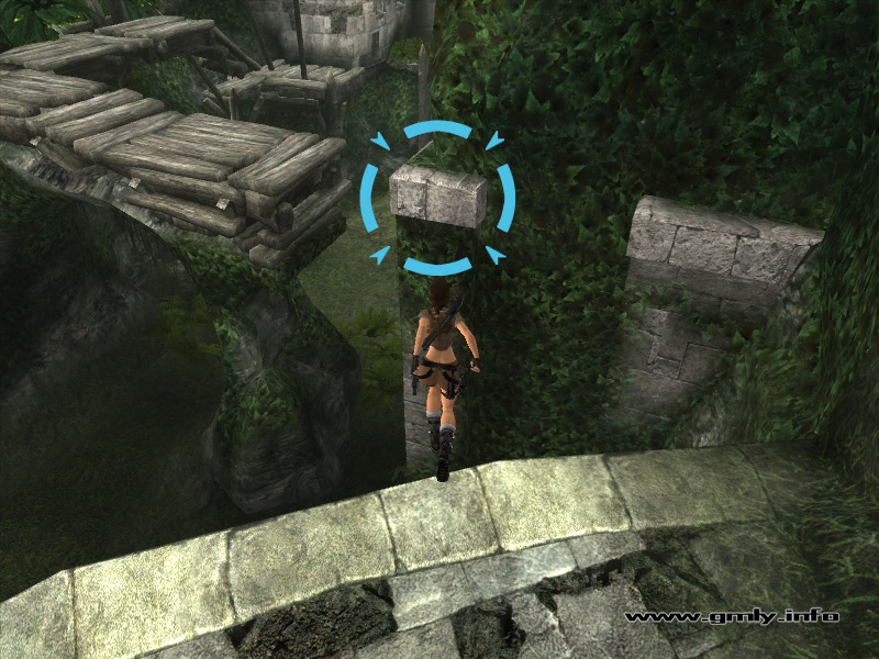 捷径 2:在木桥处,直接跳到两个吊桥下,别理两只狼,在前方图中箭头处可以使用墙角虫,即劳拉身体左侧于石头的表面垂直,举枪,然后左侧翻,这时候你会发现劳拉站在了本身无法跳至的石头上,跳过了上第一座断桥,再落下,再打狼,再爬上的一段路。