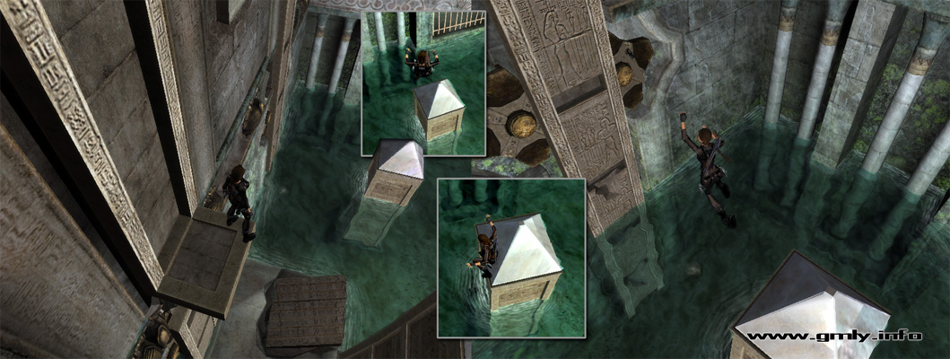 捷径 7:在POSEIDON(波塞冬)神殿,可以在此天桥直接跳抓到通向钥匙房间的边沿,而不用费事的放出木筏。但最好先将房间的水放满,在跳抓失败后可以迅速的游回天桥。