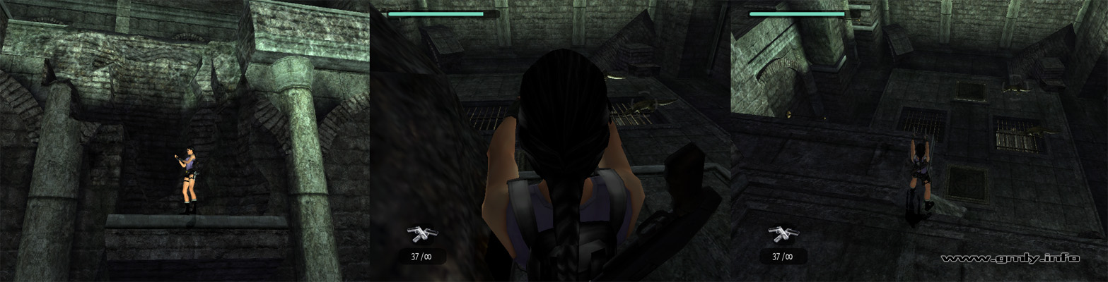 捷径 2:在有平台、木乃伊、底部有狗雕像(以及可能出现的旋转刀)的房间,先跳到左边的小平台,然后走到边缘反手抓住,移动到左边并奋力一跳,可直接落在下面的入口处。