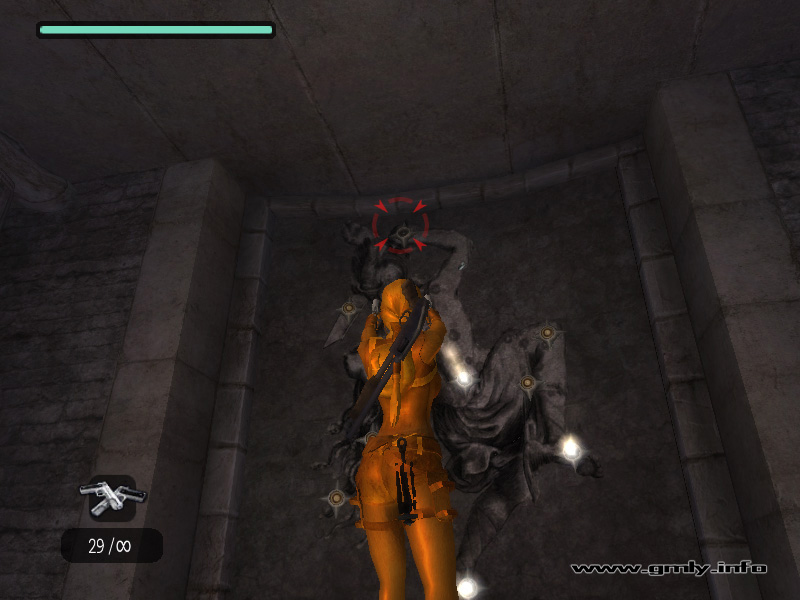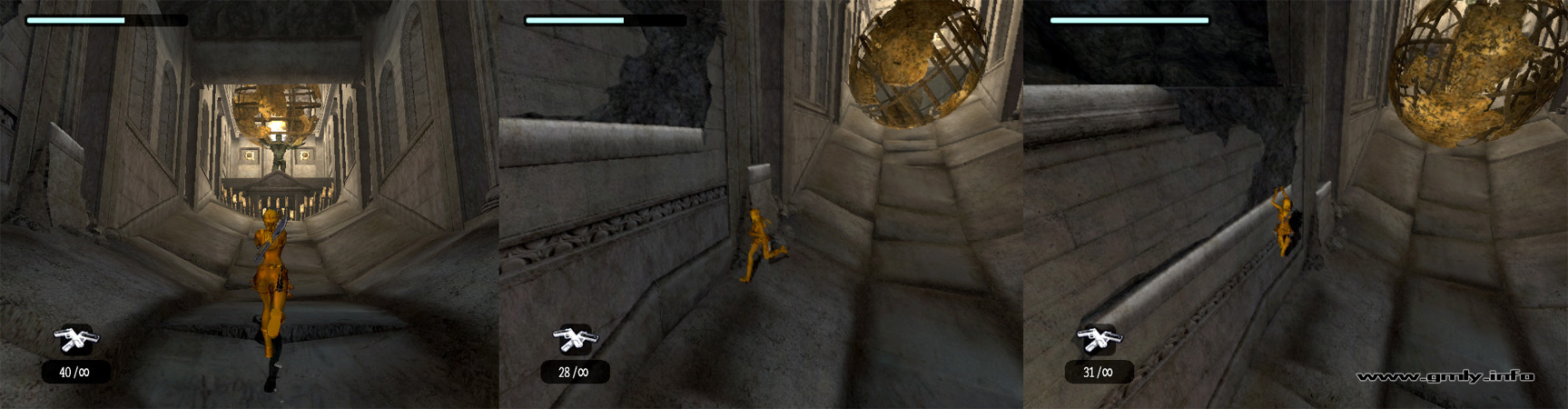 捷径 2:在狮身人面像前,在图中所示的地方使用墙角虫,即举起枪向左前方翻滚。劳拉会到达狮身人面像的右脚处,往前跑,直接跳上狮身人面像正下方的门的左角——一个透明的平台,往右走到达可以站立的极限的地方,直接跳过大门。这是本关一个严重的Bug,若利用可以省掉本关一半的任务。
