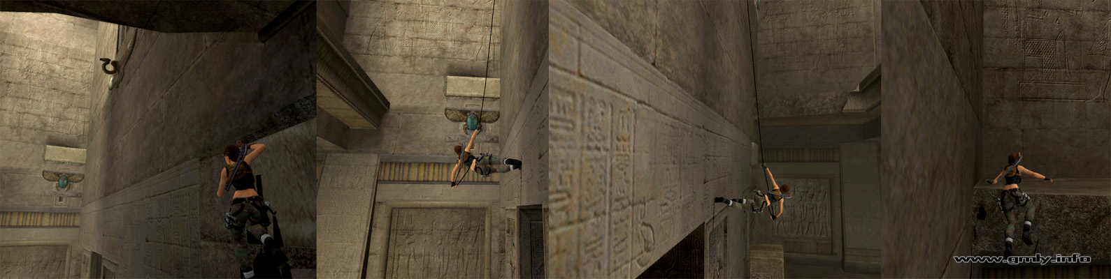 捷径 1:在有斜坡和平台的房间,拉出箱子并在这个房间第一次使用抓钩处,荡过去不要抓圣甲虫,而是再荡回来,到最高处跳起,可直接爬上二层平台,并可省下一段跑步的路。(感谢【Tomb raider】提供)