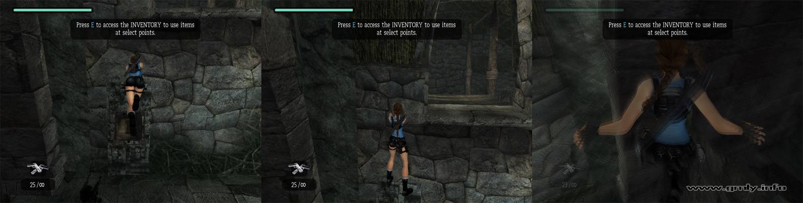 另外一种方法是直接用墙角虫左侧滚翻到钥匙孔上,但是因为很难站立,所以翻上去之后最好一直按住在面朝钥匙孔所在墙壁的方向键使劳拉不会掉下来,再趁机跳过村口木门。
