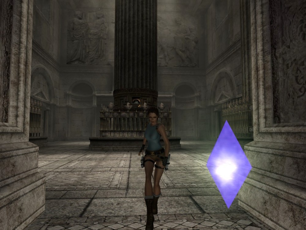 - 托比 - 铅变黄金,那可是炼金术士的梦想。事实上,除了常见陷阱,比如滚球、长钉、破裂的地板等等,我们利用一代的引擎,唯一还能做的就是交换房间。我们可以制作两个同样尺寸的房间,以便于将其交换,在劳拉不在那个房间的时候,我们就可以进行交换。我们成功地把这个概念做了充分的发挥,就像这里的沙子谜题。在这个房间,一旦你拿掉地板的支撑物,那么整个房间就会坍塌,整个场景就会变得面目全非。也就是说,你可以通过两种不同的方式来穿过房间。